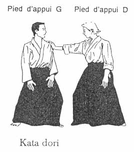 Prolonger le mouvement de saisie de uke avec pivot circulaire symétrique en tai sabaki de façon à l'amener au déséquilibre. La main opposée à la saisie menace uke au visage lors du déplacement et fini en saisie de la main de kata dori. Large écart latéral du pied avant avec pivot du bassin qui amène uke en déséquilibre et en position pour recevoir naturellement ikkyo.